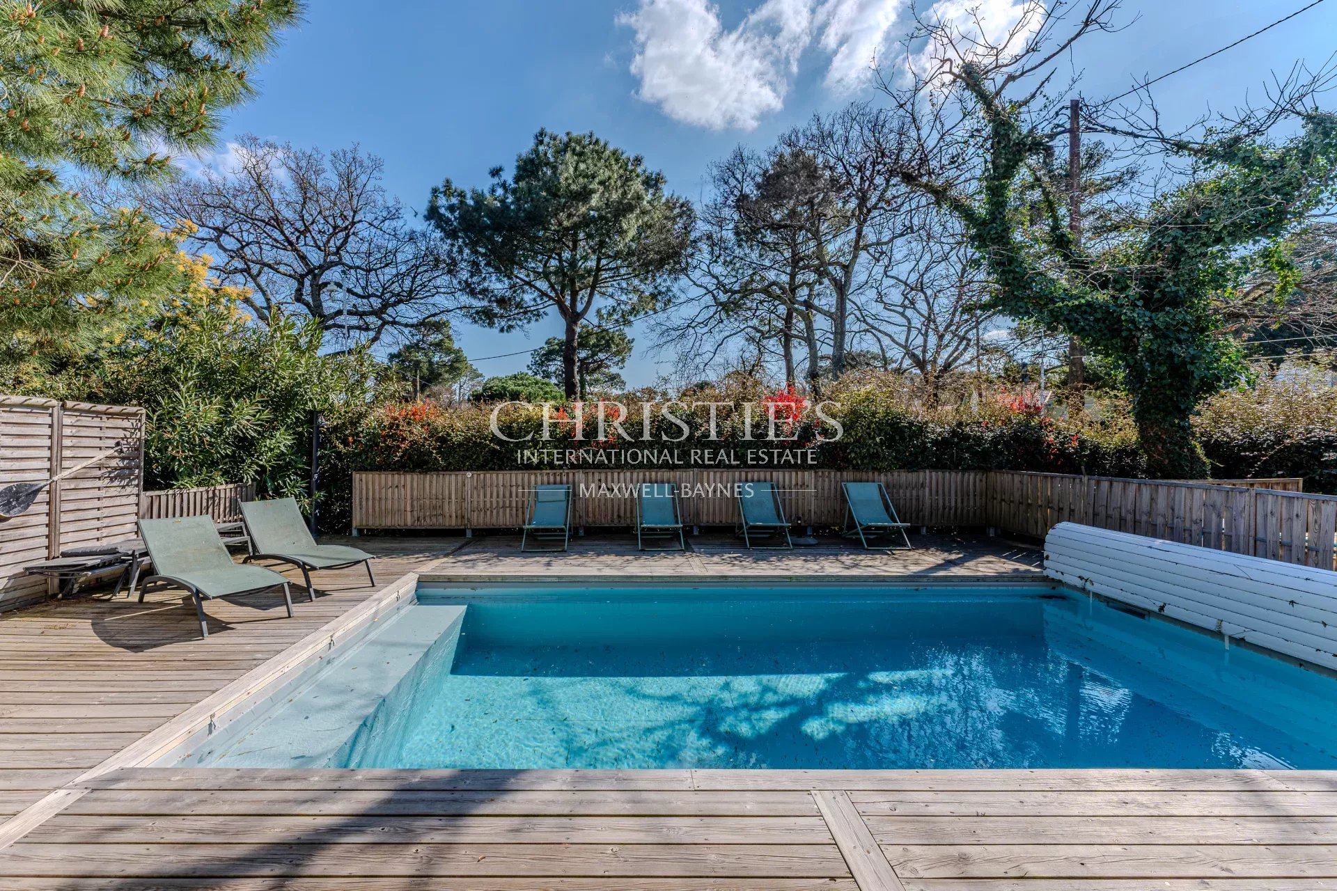 Une maison d'environ 110 m², double séjour avec cuisine équipée, donnant un accès direct sur la piscine et la vue sur les pins. 4 chambres, dont 3 salles d'eau.