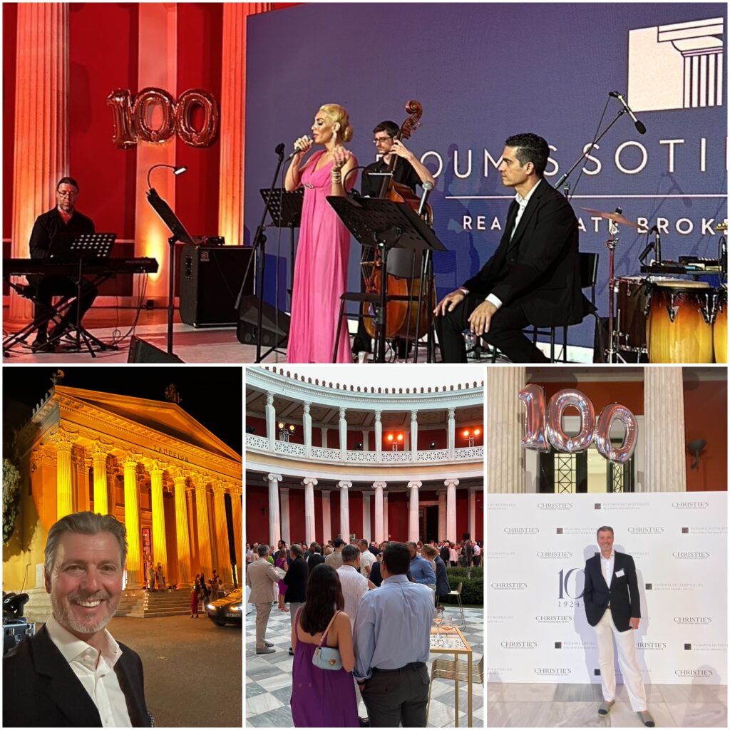 Ploumis Sotiropoulos a invité les co-fondateurs de Maxwell-Baynes, Karin Maxwell et Michael Baynes, à Athènes à la fin du mois de juin 2024 pour célébrer ensemble leur 100e anniversaire avec de nombreux dirigeants et propriétaires des affiliés (principalement) européens de Christie’s International Real Estate.